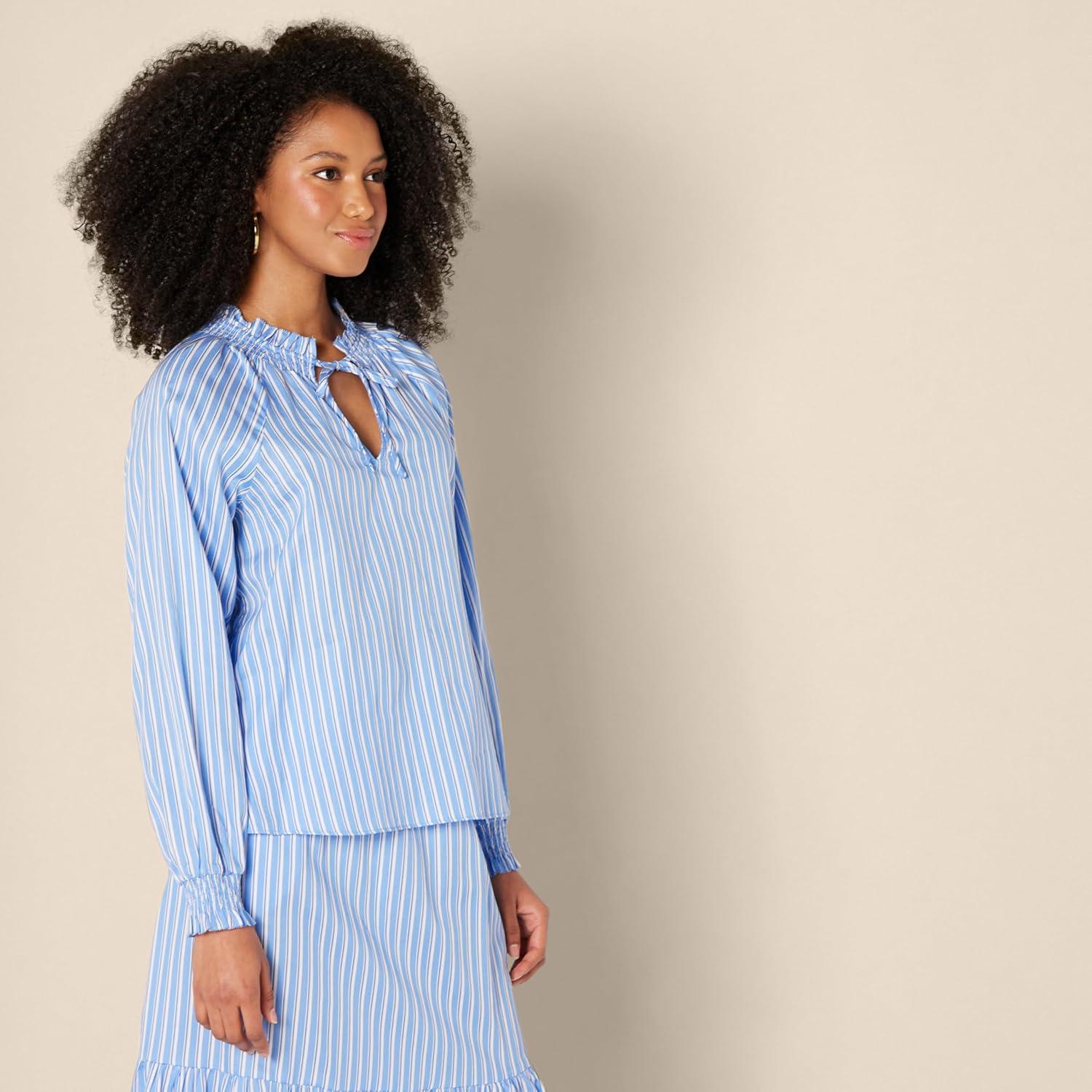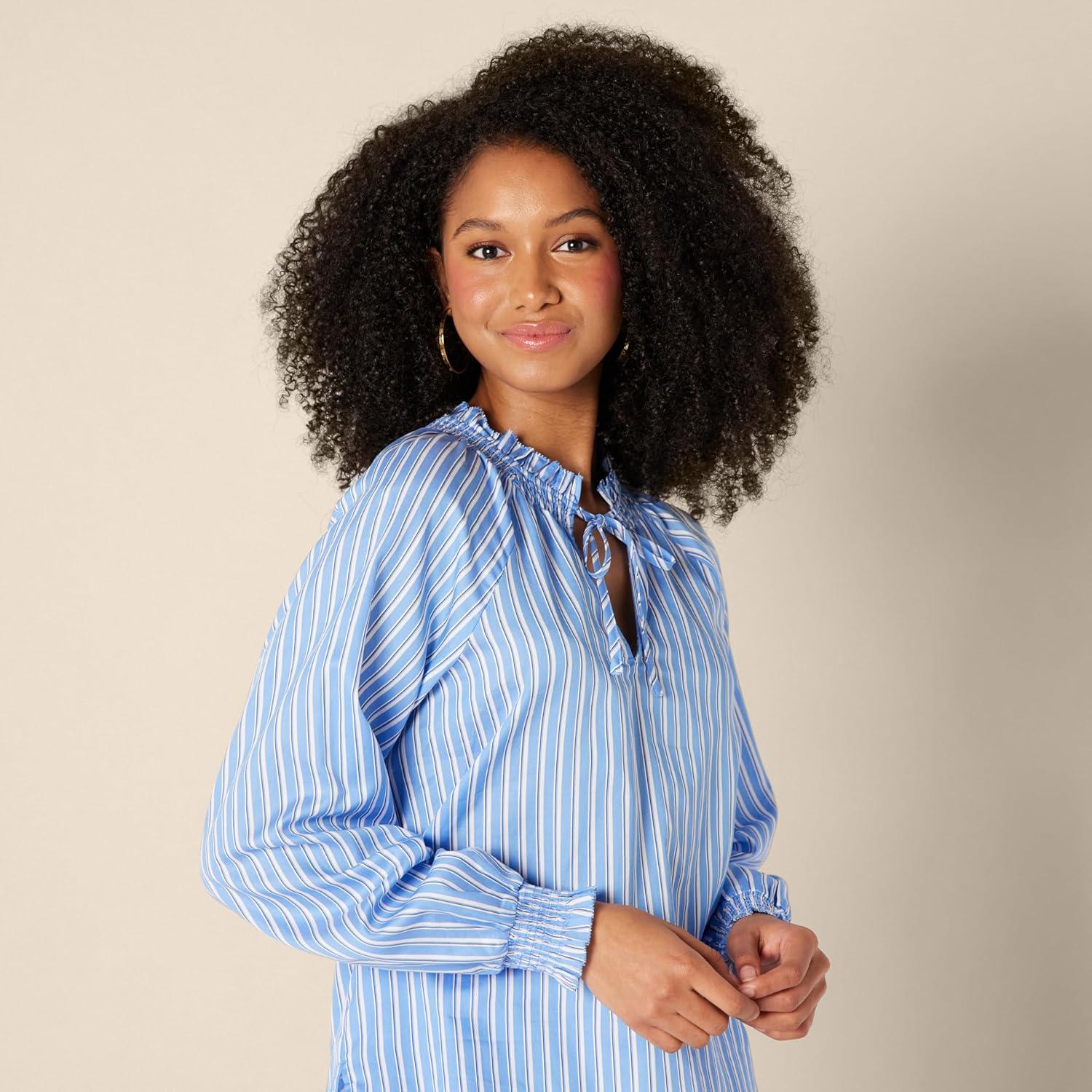 Amazon Essentials Women’s Relaxed-Fit Ruffle-Neck Cotton Sateen Long-Sleeve Blouse (Skirt Sold Seperately)(Blue White Stripe)