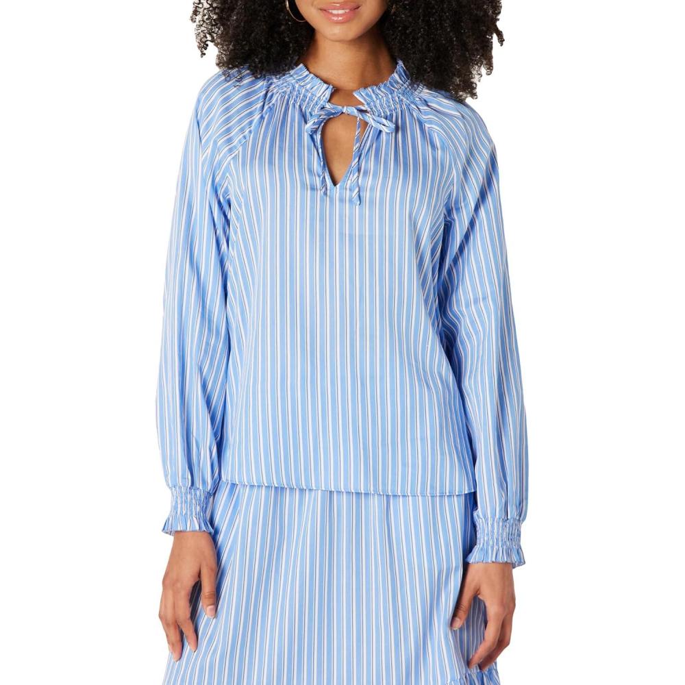 imageAmazon Essentials Womens RelaxedFit RuffleNeck Cotton Sateen LongSleeve Blouse Skirt Sold SeperatelyBlue White Stripe