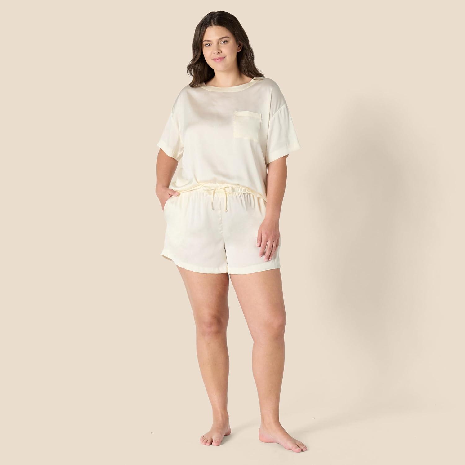 Amazon Essentials Women’s Satin Short Sleeve T-Shirt and Short Sleepwear Set(Ivory)