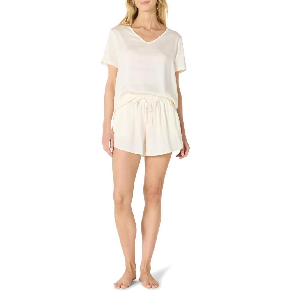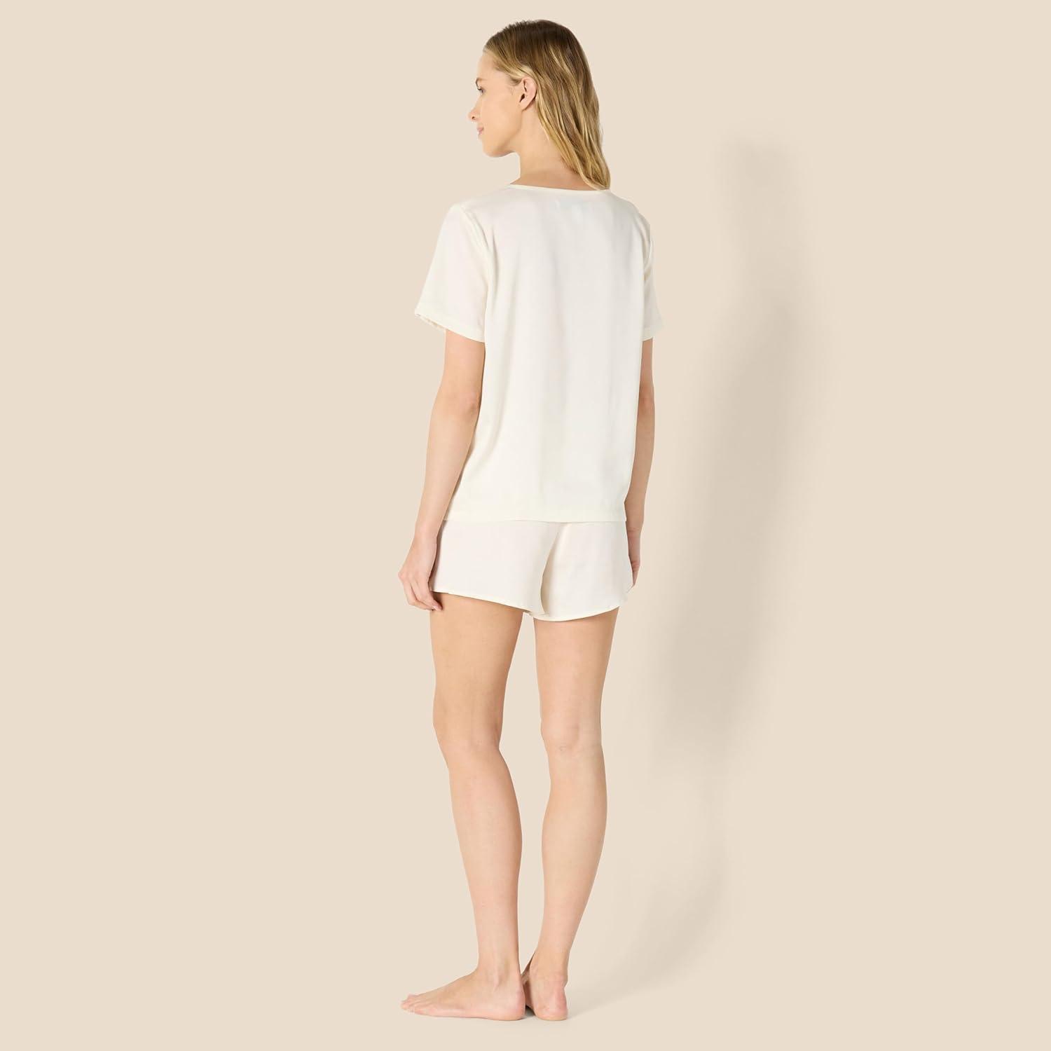 Amazon Essentials Women’s Satin Short Sleeve V-Neck T-Shirt and Short Sleepwear Set(Ivory)