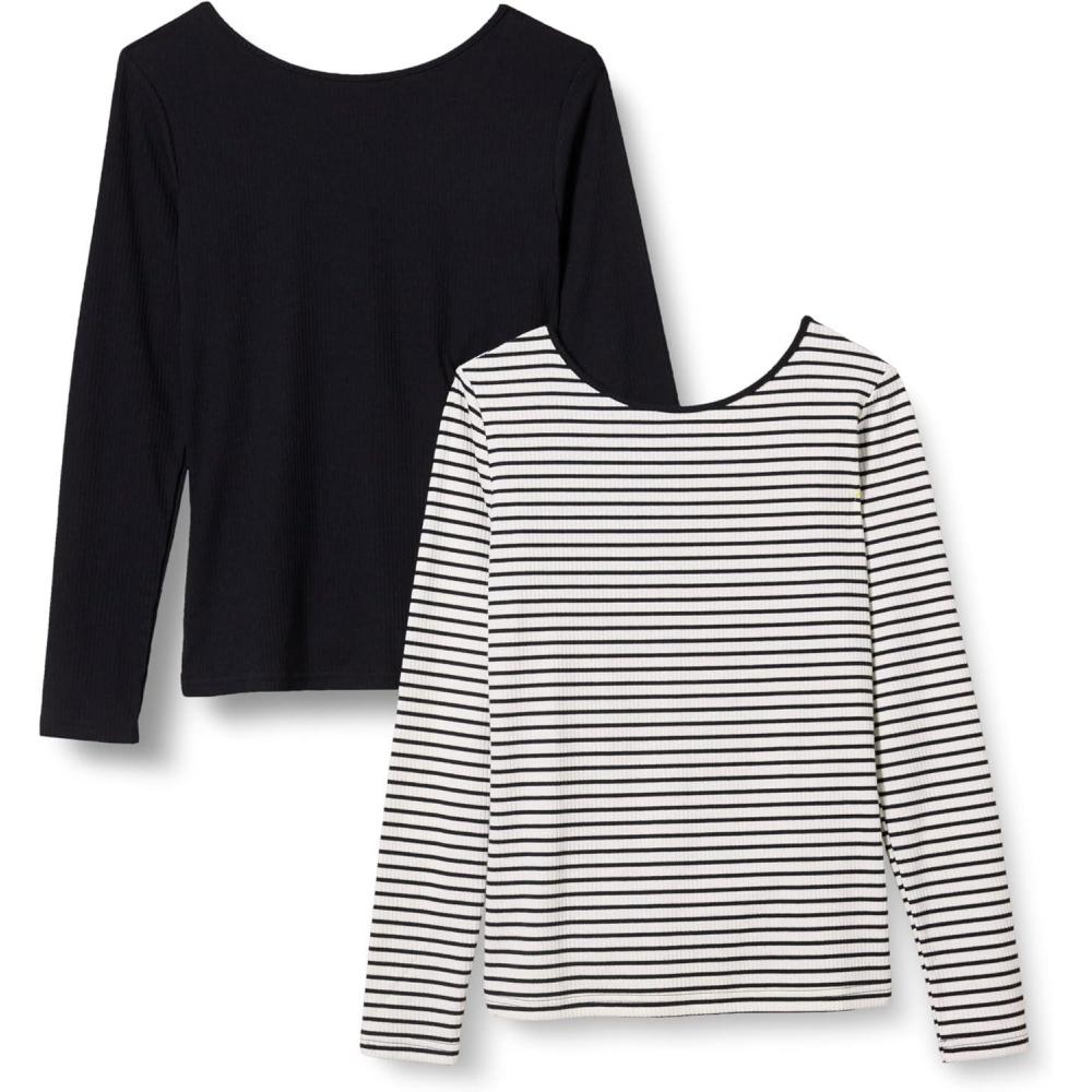 Amazon Essentials Women’s Scoop Back Long Sleeve Slim-Fit Rib-Knit T-Shirt, Pack of 2(Black/French Stripe)