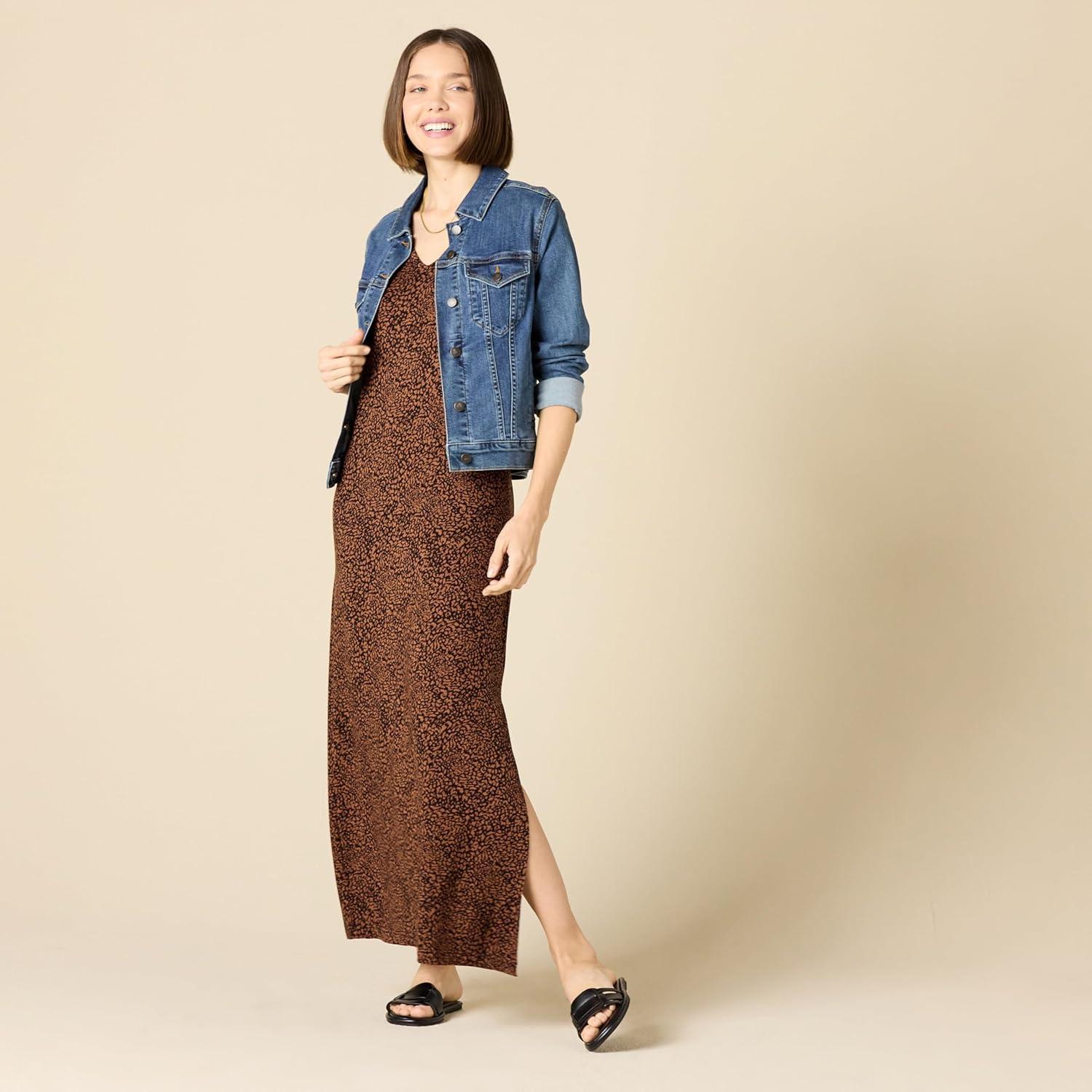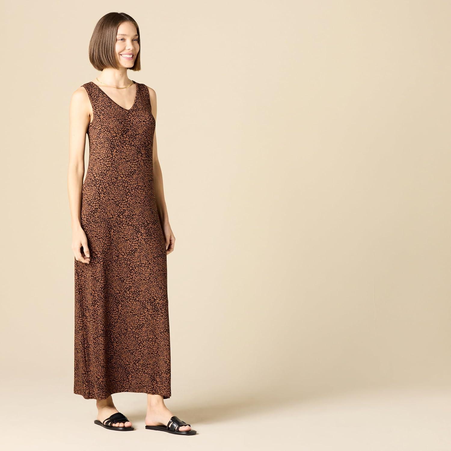 Amazon Essentials Women’s Side-Slit Jersey V-Neck Maxi Length Dress(Dark Toffee Brown Animal Print)