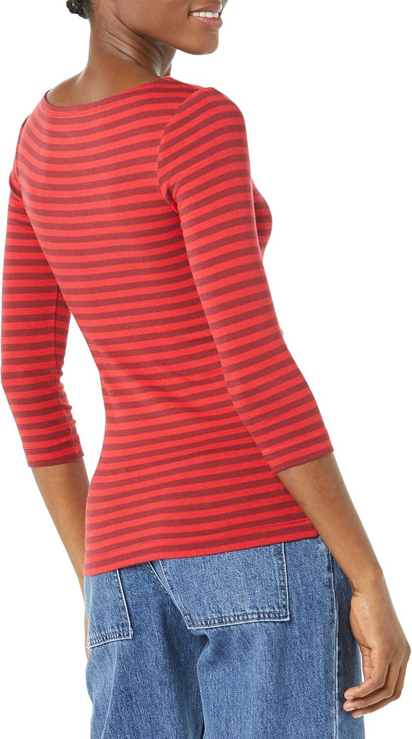 Amazon Essentials Women's Slim-Fit 3/4 Sleeve Boat Neck T-Shirt(Red Burgundy Stripe)