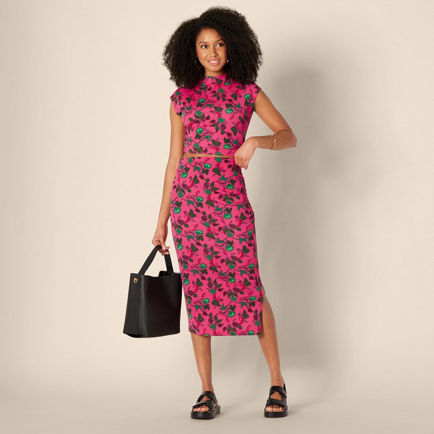 imageAmazon Essentials Womens SlimFit ExtendedSleeve Ruched Matte Jersey Top Skirt Sold SeparatelyHot Pink Leafy Floral Ditsy