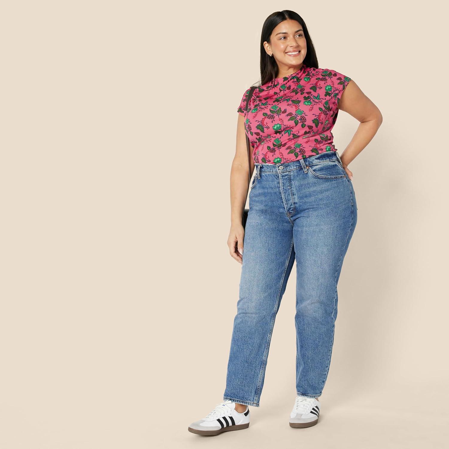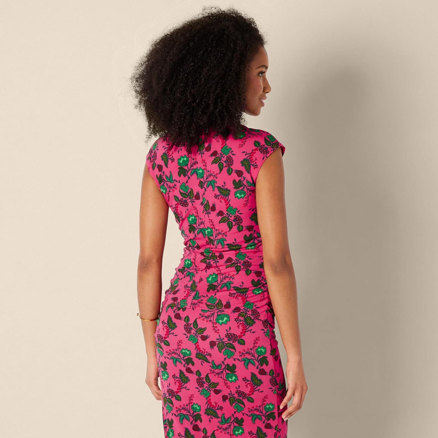 Amazon Essentials Women’s Slim-Fit Extended-Sleeve Ruched Matte Jersey Top (Skirt Sold Separately)(Hot Pink Leafy Floral Ditsy)
