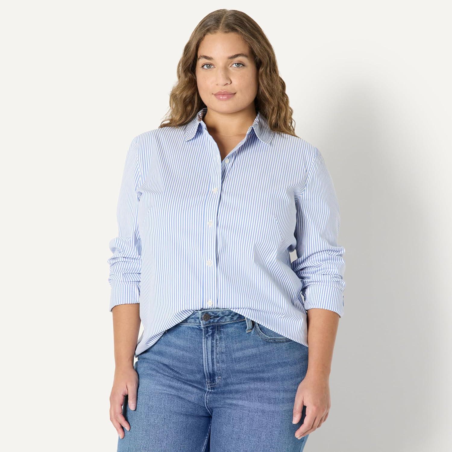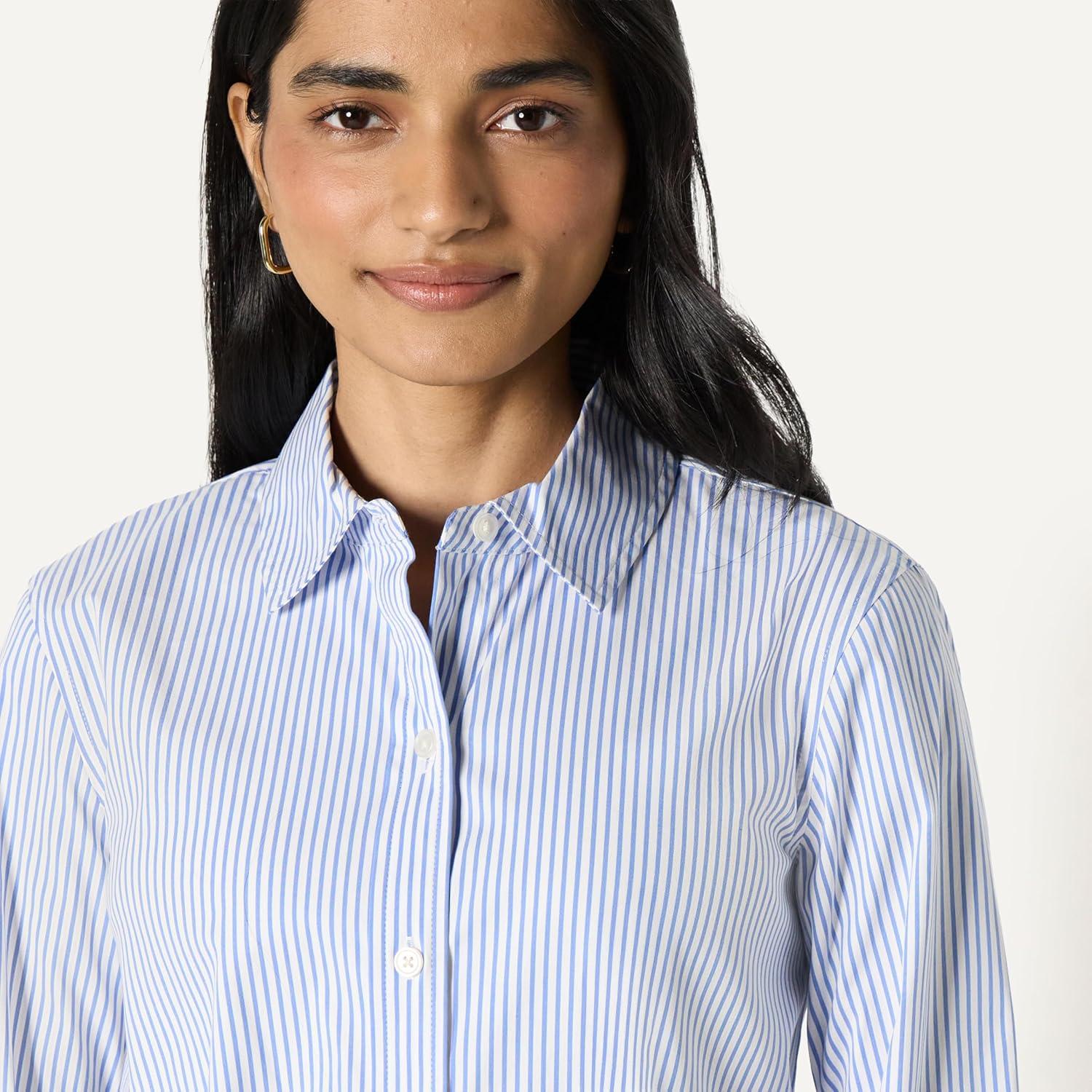 Amazon Essentials Women's Slim-Fit Stretch Poplin Button-Up Dress Shirt(White Blue Mini Stripe)