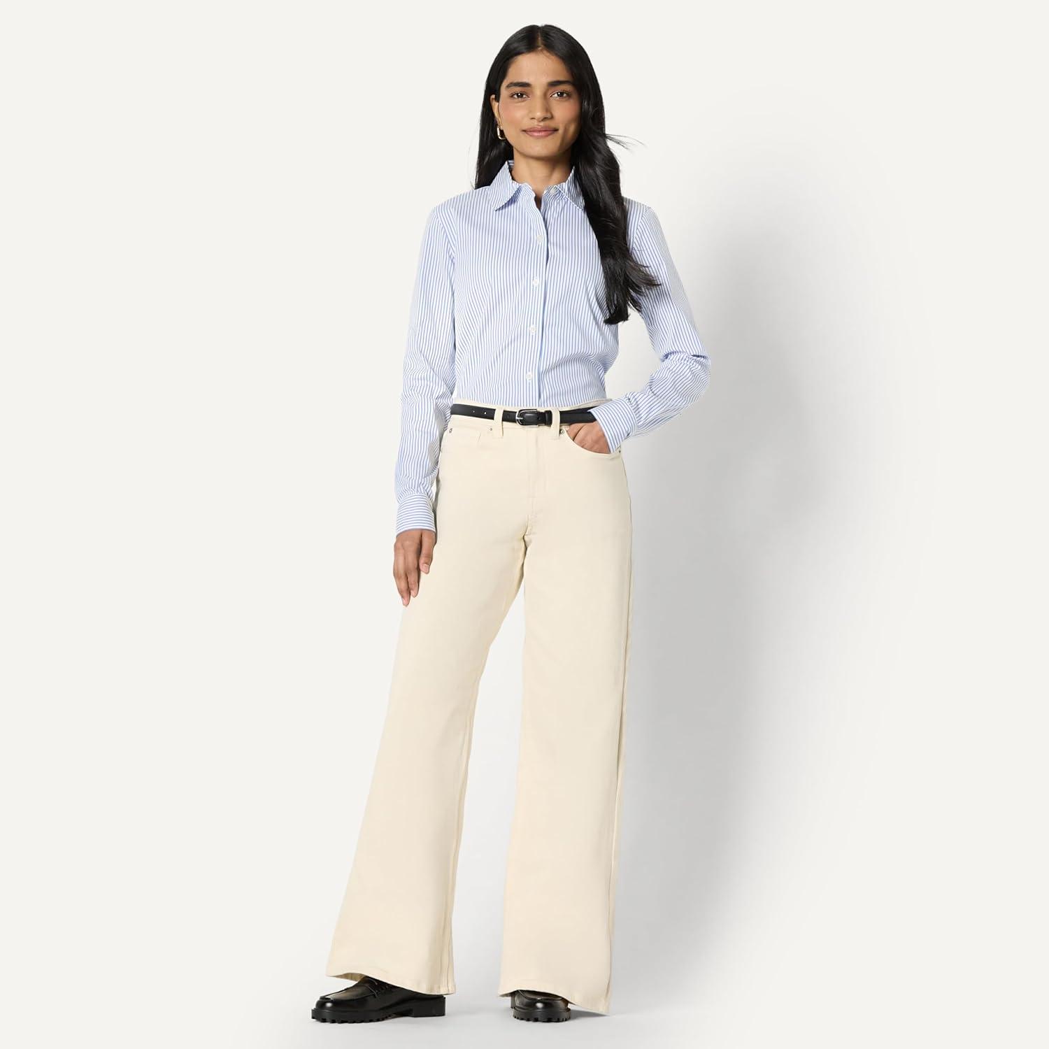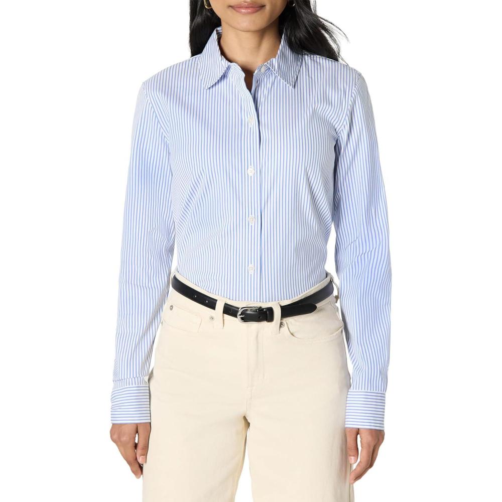 Amazon Essentials Women’s Slim-Fit Stretch Poplin Button-Up Dress Shirt(White Blue Mini Stripe)