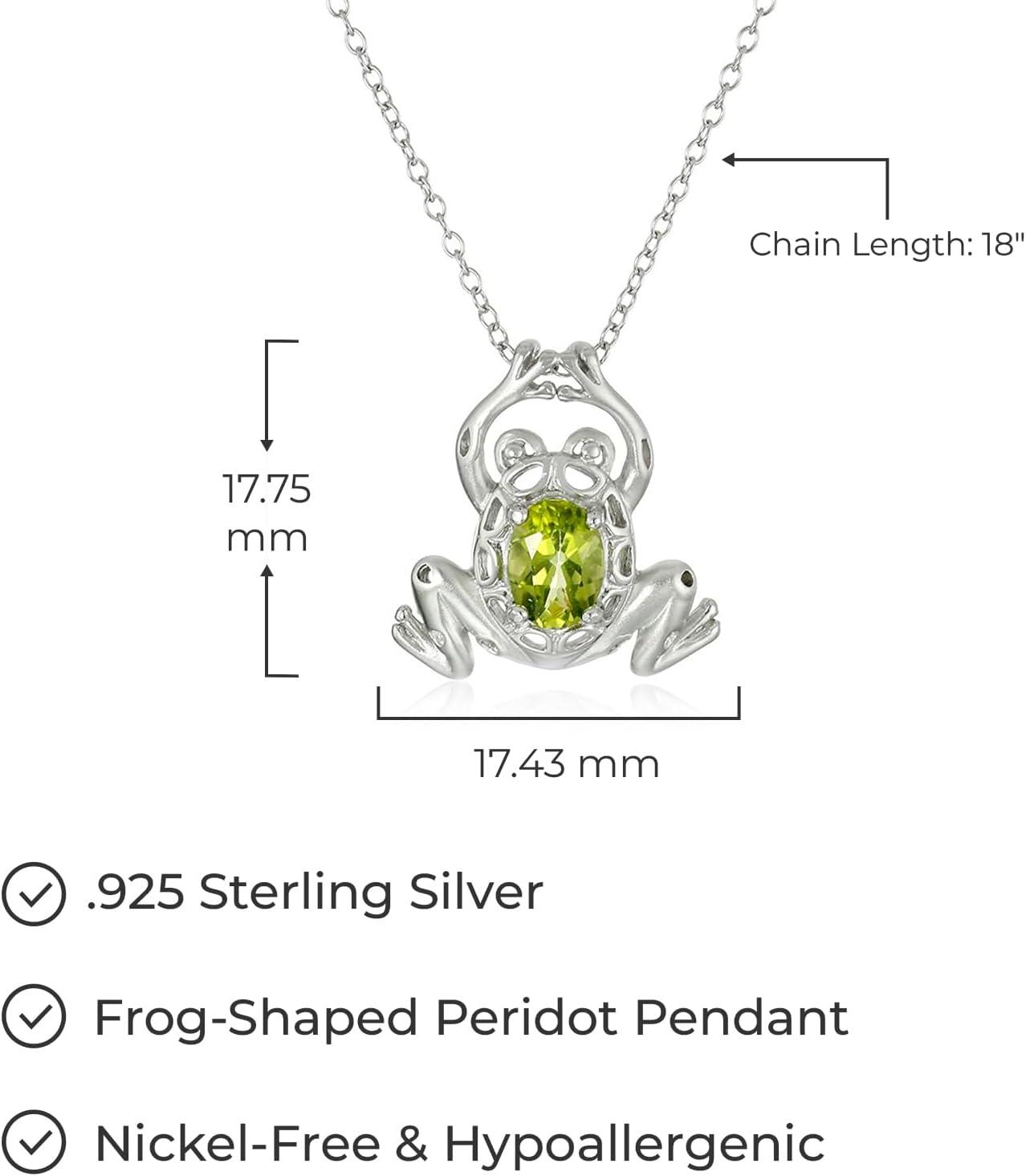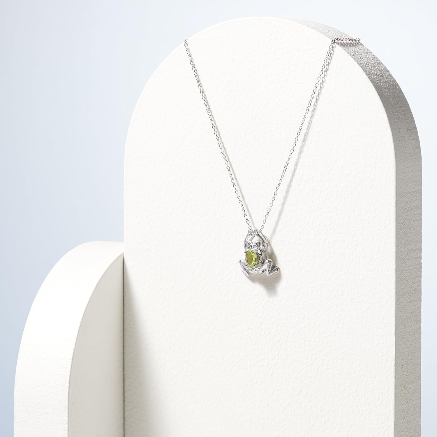 Leaping beauty. This sterling silver frog pendant is a bright celebration of nature with its sparkling spring-green peridot gemstone center. Rhodium overlay protects the silver against scratches and tarnishing. A sterling silver chain is included.